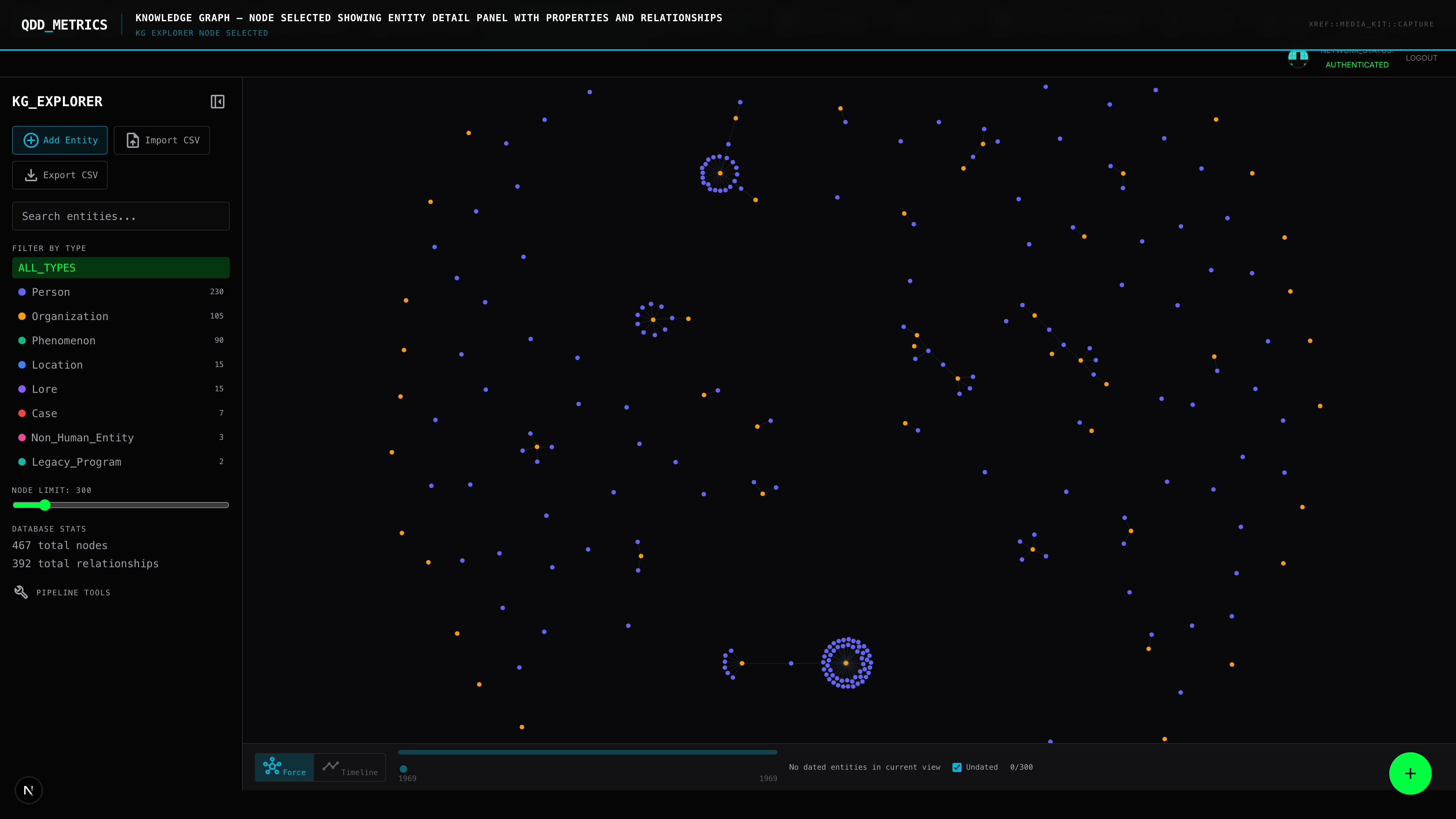 The graph is live. The timeline updates as new events, documents, and testimony enter the system.